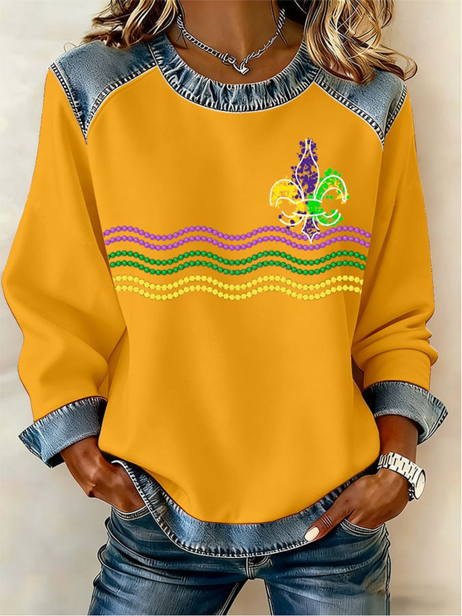 Women's Mardi Gras Fleur De Lis Denim Patchwork Top