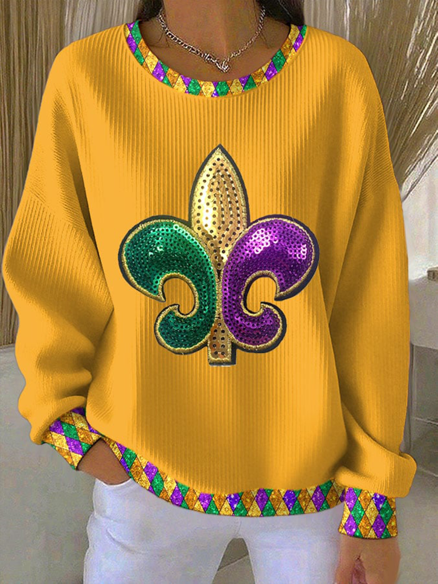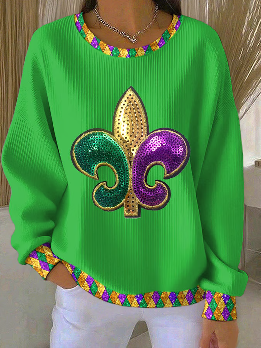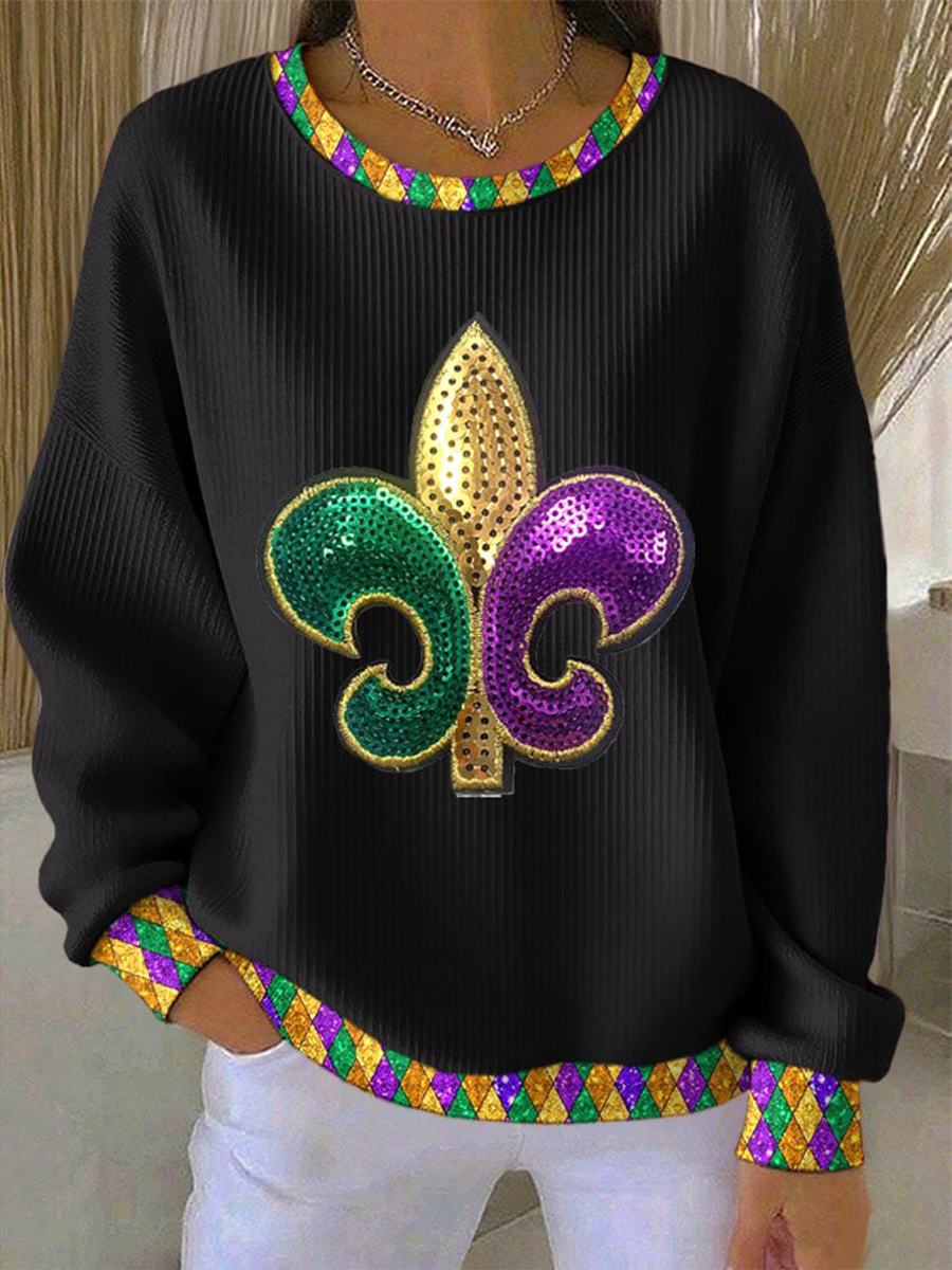 Women's Mardi Gras Fleur De Lis Ribbed Round-Neck Sweatshirt