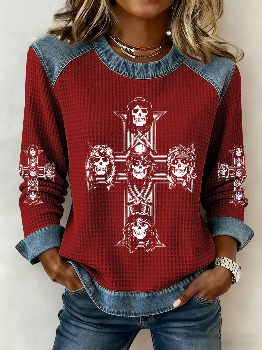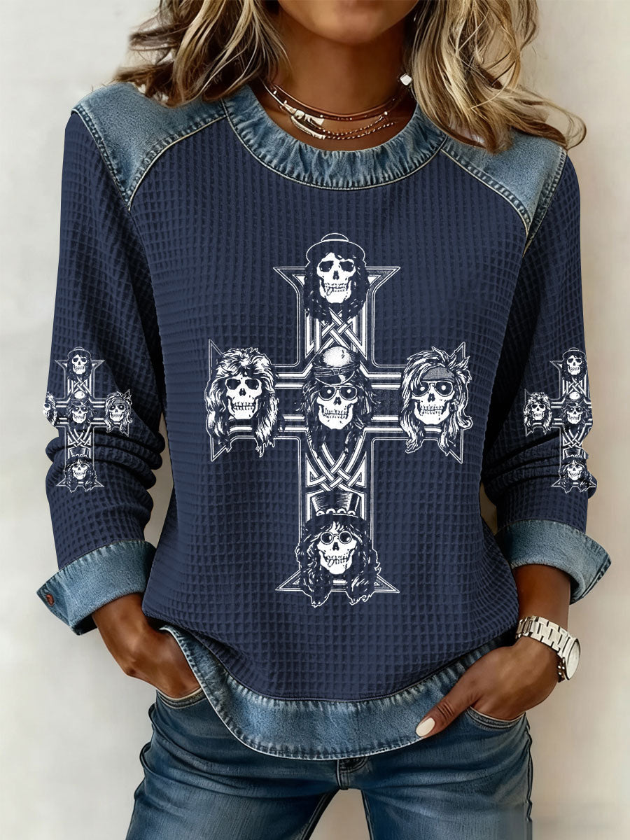 Women's Rock Print Denim Patchwork Top